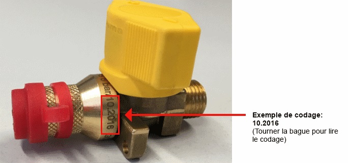 Dans le cadre de son assurance qualité, Truma a constaté que la prise extérieure de gaz Truma et deux vannes de prélèvement de gaz pourraient présenter un défaut d'étanchéité. Seuls les produits avec un capuchon jaune et le codage ci-après sont concernés