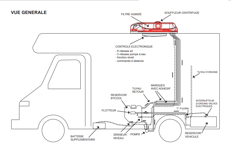 Sur mon Bycool en plus de l'alimentation électrique il y a trois tuyaux qui rejoignent l'évaporateur, bien sur un qui monte l'eau au départ de la pompe et forcément deux par lequel le trop plein redescend, ils sont reliés avant le réservoir pour n'en faire qu'un qui rentre dans ce dernier. La notice de pose: