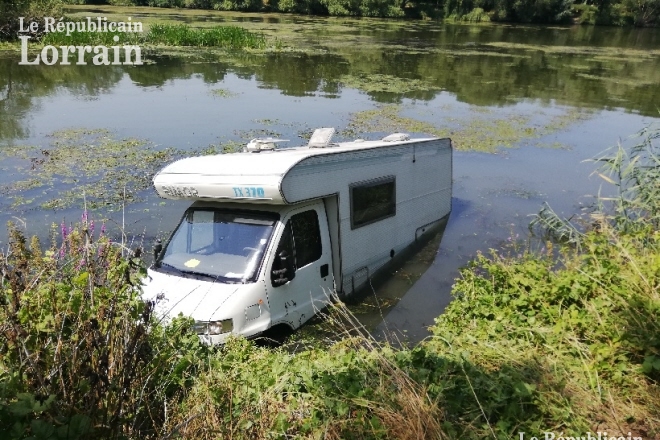 Digne d’un gag. Un camping-car s’est retrouvé dans la Moselle ce mercredi en début d’après-midi. Le conducteur, un Néerlandais, s’était semble-t-il installé sur le parking municipal non loin du camping. Il a préféré s’éloigner quelque peu des places réservées à ces engins. La proximité de l’eau est plaisante par ces journées de forte chaleur.