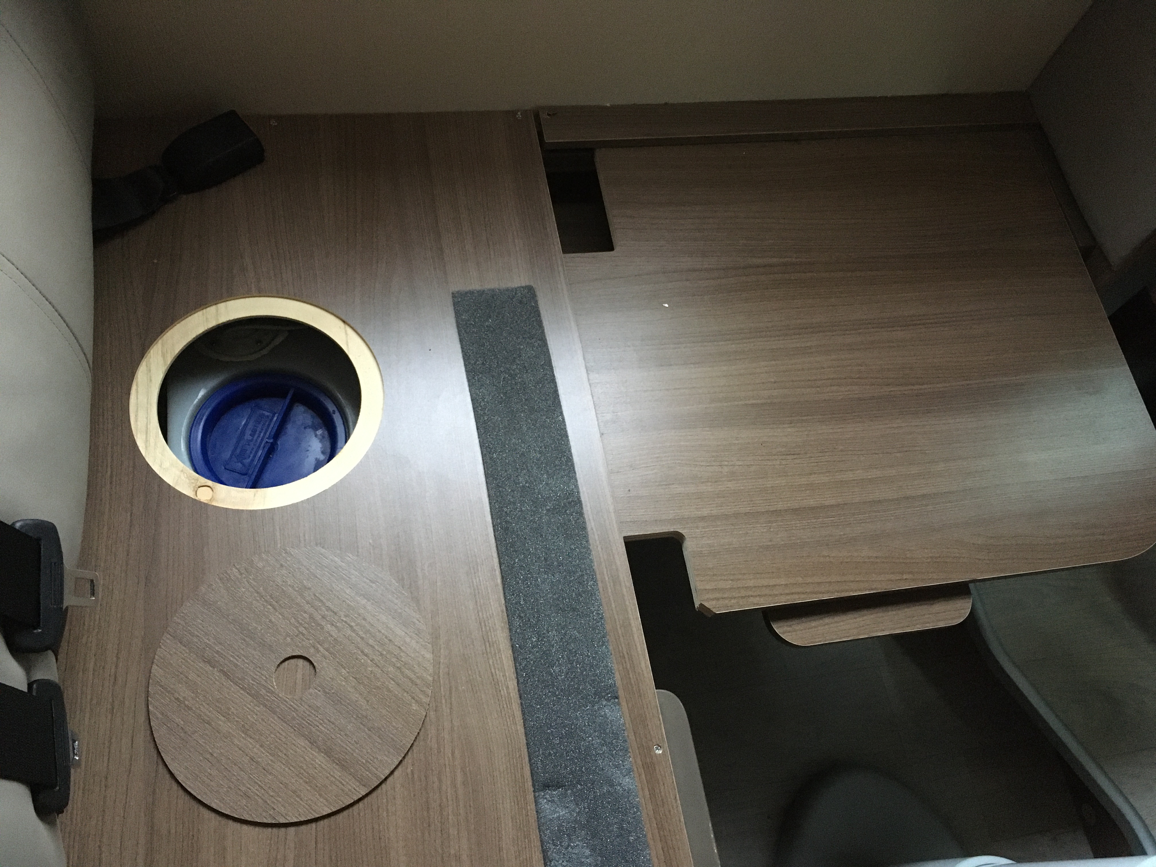 La partie supérieure qui ferme le réservoir et qui comporte la trappe circulaire de visite en bois est effectivement fixée par des vis qui sont cachées par des obturateurs (pastilles adhésives). Inutile d'y toucher. Pour accéder à la pompe il faut faire coulisser la partie située à droite sur votre photo. La faire coulisser sous l'autre partie tenue par les vis ce qui n'est pas toujours facile à faire (le coulissement se mettant parfois de travers) Elle doit recouvrir et rendre invisible le bouchon supérieure d'ouverture du réservoir eau propre. A partir de là on peut soulever le dessus du caisson qui renferme la pompe et aussi le buzzer du radar de recul. Pour le reste il faut faire comme indiqué dans le message précédent.
