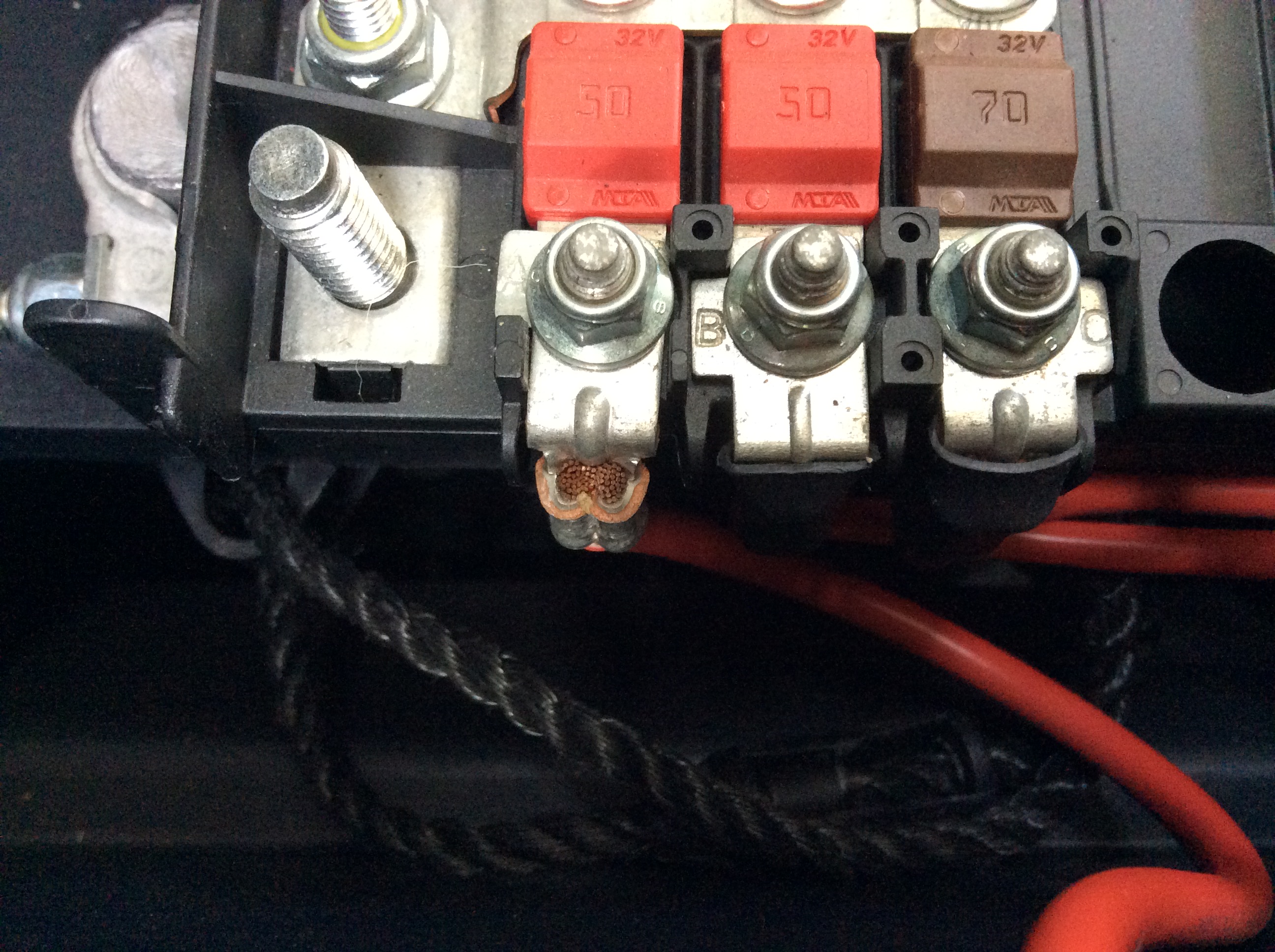 Si j’ai bien compris, vous n’avez pas de tension a la sortie du fusible rouge 50A de gauche ? pouvez confirmer afin qu'on parle de la même chose