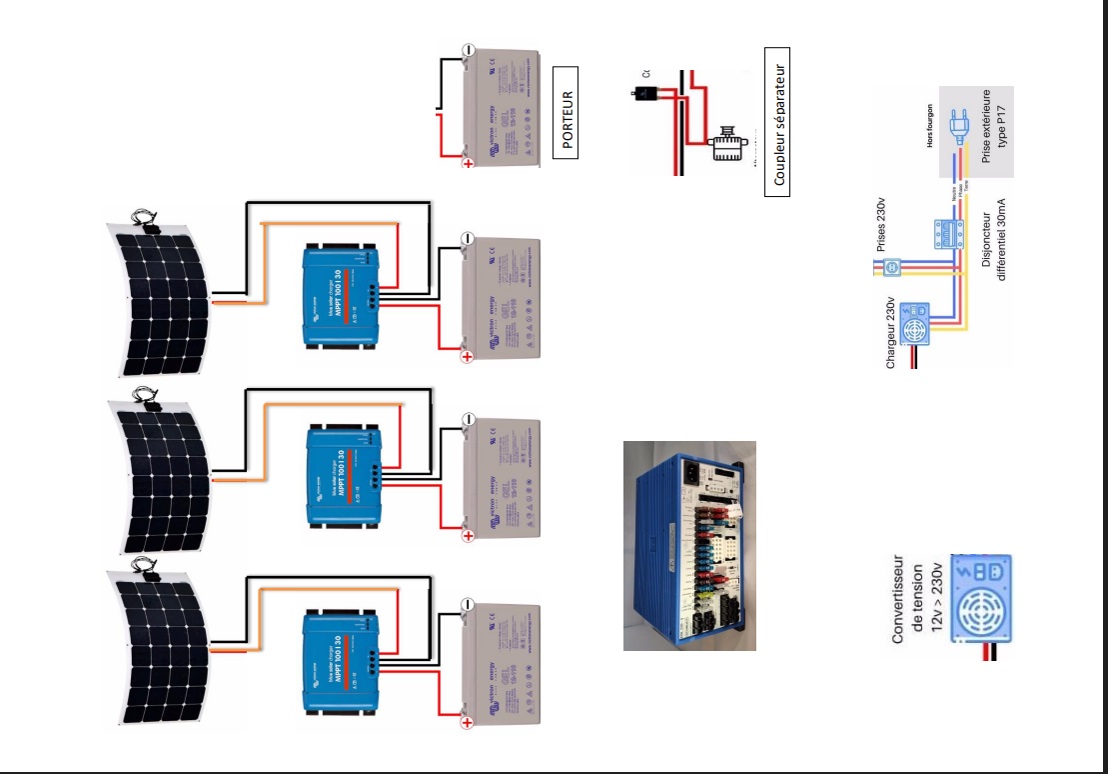 ton schéma fonctionne au solaire mais il faudra 3 chargeurs en 220V pour respecter la séparation.