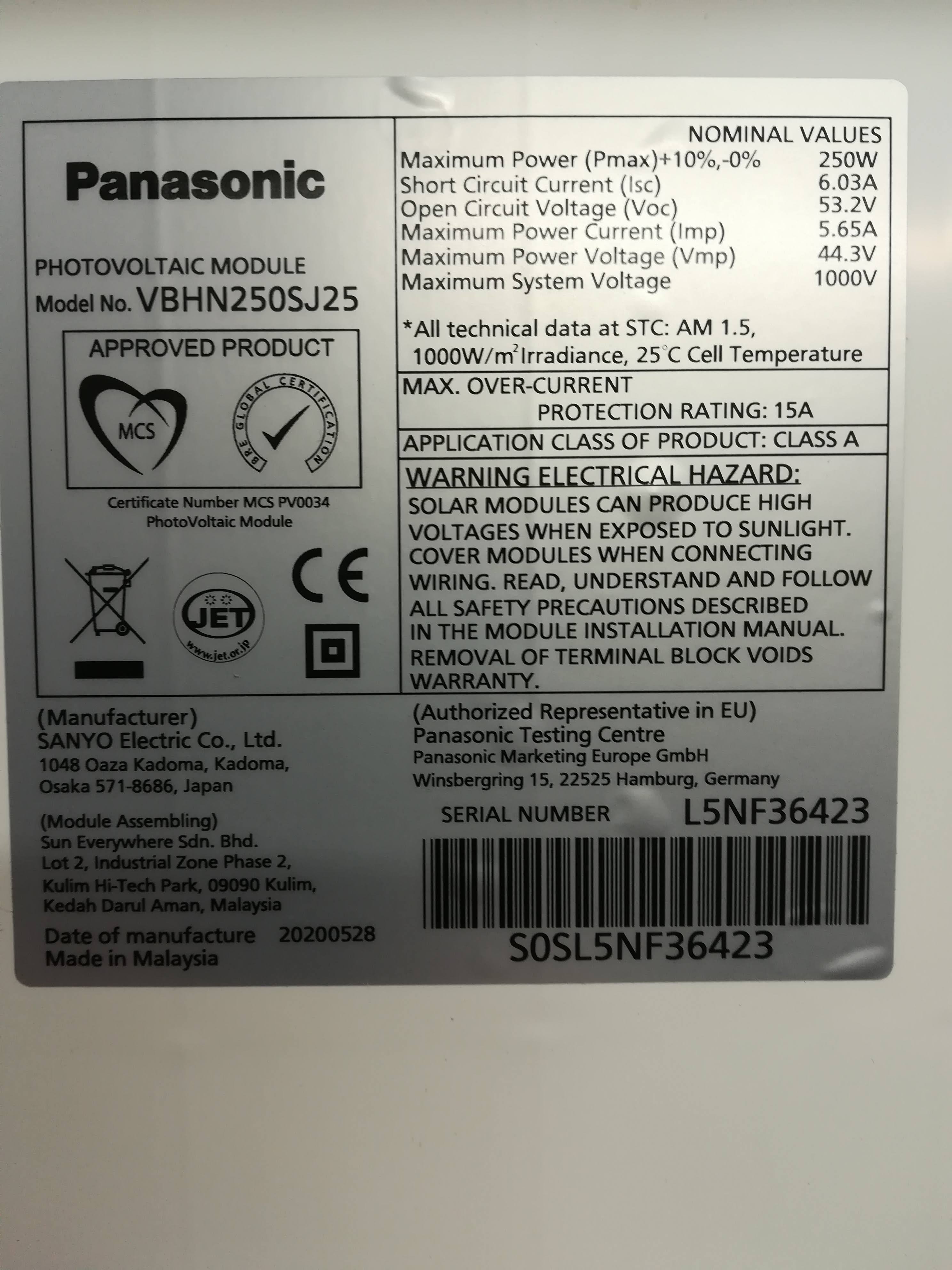 [Données techniques] Puissance nominale(Pmax) : 110W -- Tension max(Vmp) : 19,10V -- Puissance max. courant(Imp) : 5,76A -- tension à vide(Voc) : 23,20V -- courant de court-circuit(Isc) : 6,15A -- courant max. Tension du système : 1000VDC -- Température de fonctionnement : -45°C à +85°C -- Dimensions : 1190*510*35mm --Poids : 7.0Kg