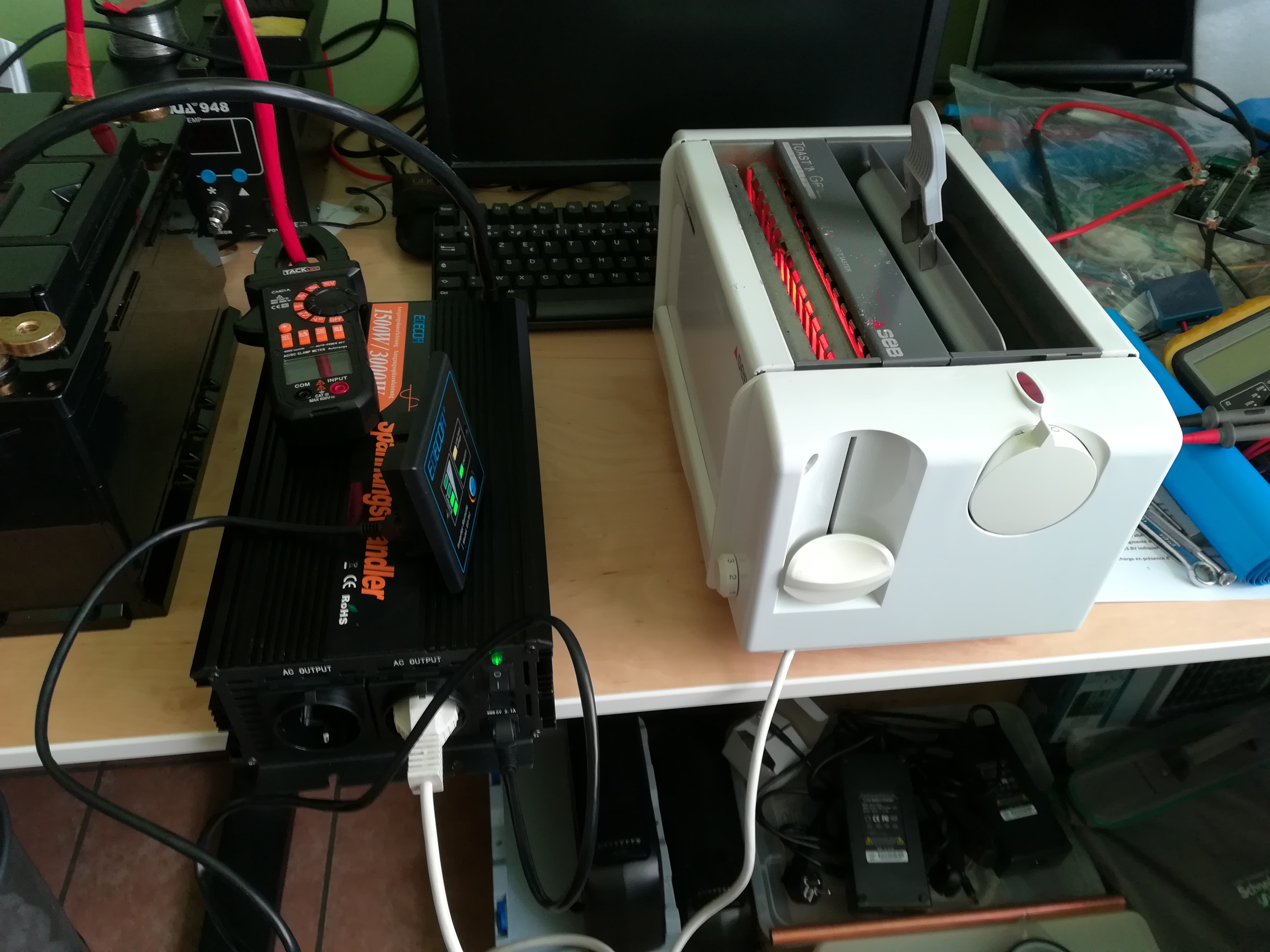 j'ai d'abord fait un essai avec un grille pain de 870W : bilan : 2 minutes de chauffe et j'ai obtenu mes 2 morceaux de pain grillés, le ventilateur du convertisseur n'a pas démarré, pour griller les 2 morceaux de pain j'ai consommé 3,5 Ah.