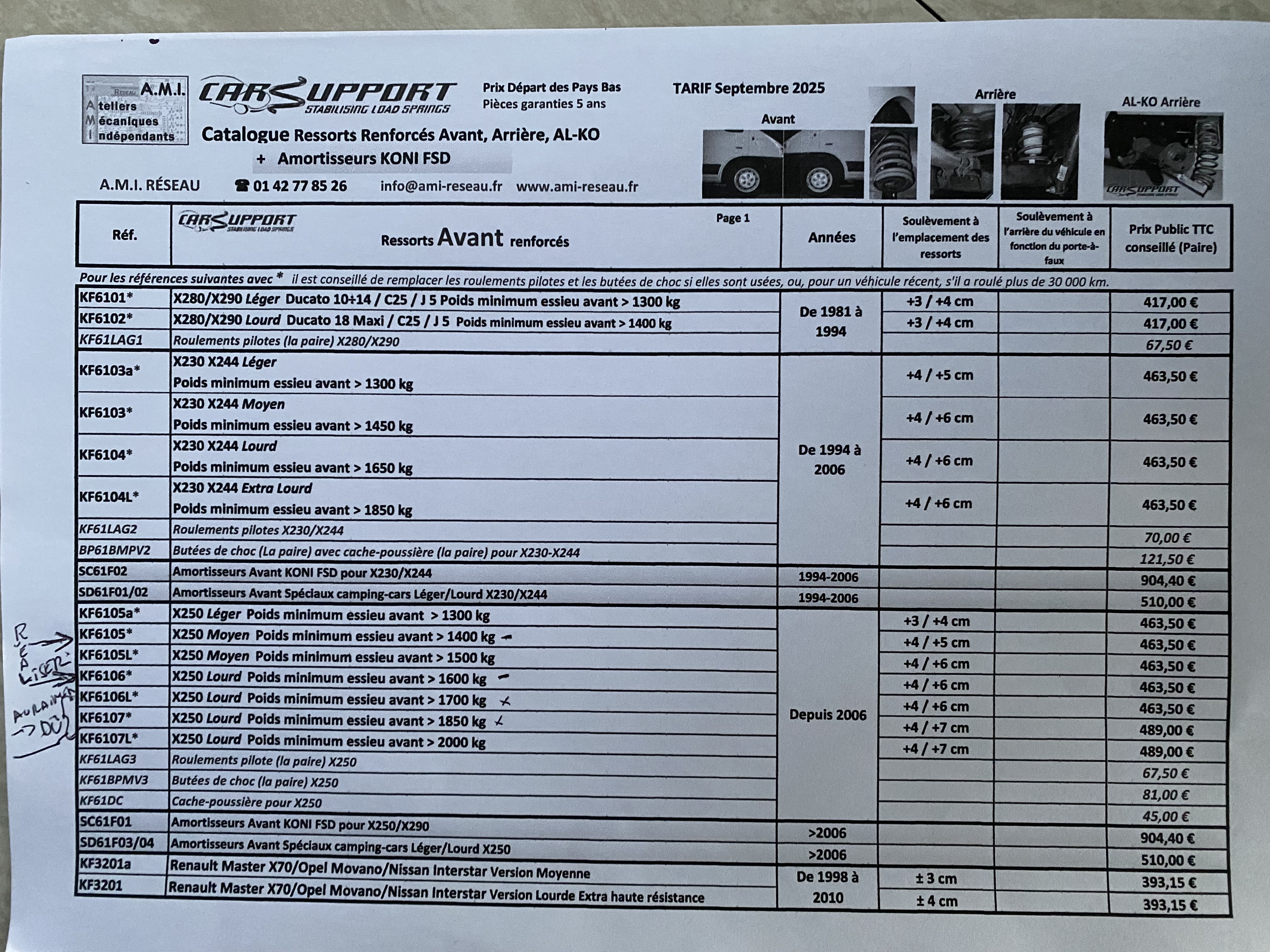 -J’ai parcouru tous les écrits et échanges de mails en 2919 entre la société Amiresau a Paris Mme Simone Germaine qui représente Koni, CarSupport Dunlop etc en France , le garage Renault à Grenoble qui a realiser le travail recommandé par Amiresau et le constructeur CarSupport en Hollande. J’ai découvert qu’ils ont de mon point de vue sous-estimé le choix des amortisseurs par rapport au poids qui n’as pas changer depuis dixit les contrôles avec les résultats que je leur ai fournis. Côté AVG ils ont mis un amortisseur 1400kg alors que c’est le côté le plus lourd 910kg , côté AVD amortisseur 1400 kg ! Je viens de regarder la grille de chez Amiresau dixit CarSupport il aurait fallu choisir les amortisseurs 1700 kg ou 1800 kg .