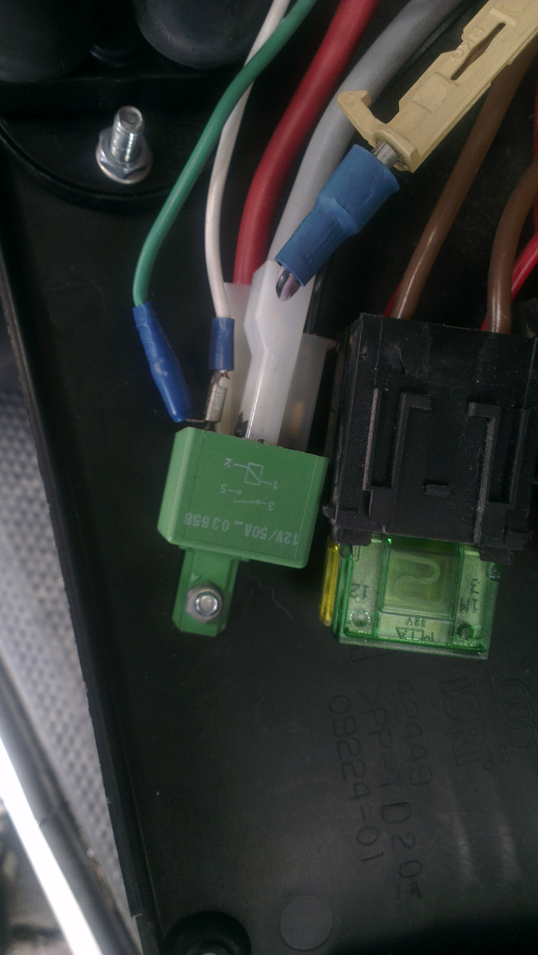 Bonsoir Cclaika 59. Je pense que les fils noir et blanc/ vert sont le - et le + de l' excitation du relais ( a contrôler ). Une fois le relais collé, tu devrais avoir la même valeur sur les deux autres fils, si le relais est bien excité et s' il n' est pas défectueux. Il est probable que ce relais soit monté par LaÏka mais pas par Fiat ( cosses dépareillées ).