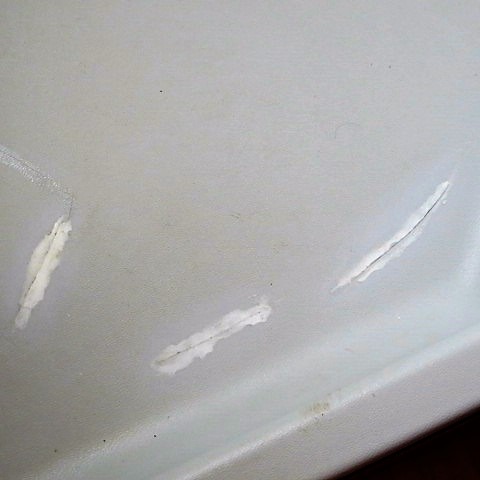 on voit bien que ces fissures ( importantes ) résultent de la tension exercée sur la matière , par la pression du poids d'une personne. Manque de matière , support insuffisant ?