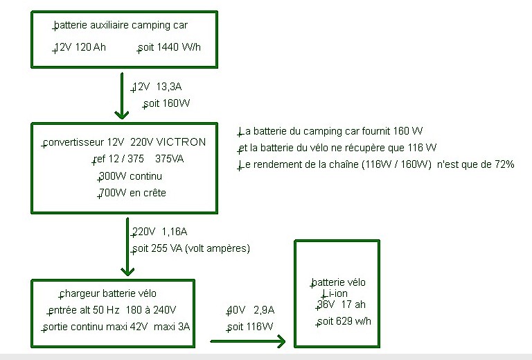 Si la batterie du vélo est complètement déchargée (ce qui est rarement le cas), Il faudra environ 6 heures et 629 W/h pour la recharger. Cela prendra 874 W/h dans la batterie du camping car, en raison du rendement du montage qui n’est que de 72%