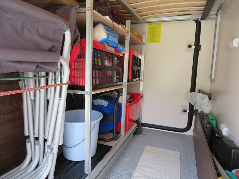 nous avons fait un porte vélos amovible un peu comme Robre Fisa, à coté nous avons de grands bacs sur roulettes que nous utilisons selon la destination du voyage, sur l'acces de l'autre coté tuyau eau,câble elec, materiel de recharge des batteries vélos. Table, chaises et cales sont dans le coffre double plancher. accessible rapidement.