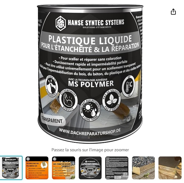j'ai utilisé un polymére sans solvant , sans bitume, avec étanchéité immédiate, et transparente -