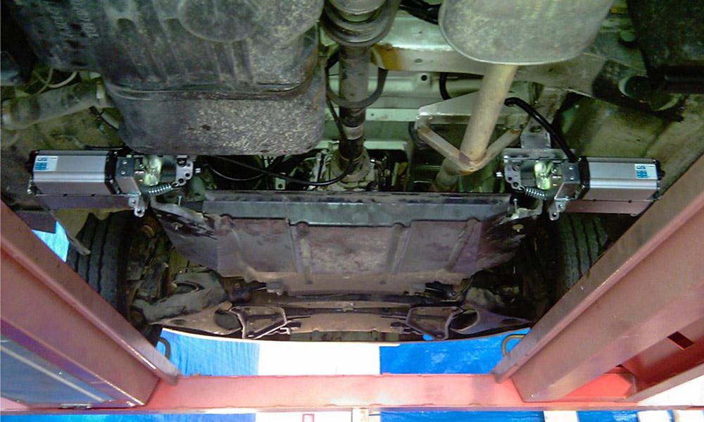 les 4 vérins se mettent sur le châssis du porteur à des points bien précis prévu par le constructeur et ceci par rapport au fabricant du porteur sans perçage du châssis.