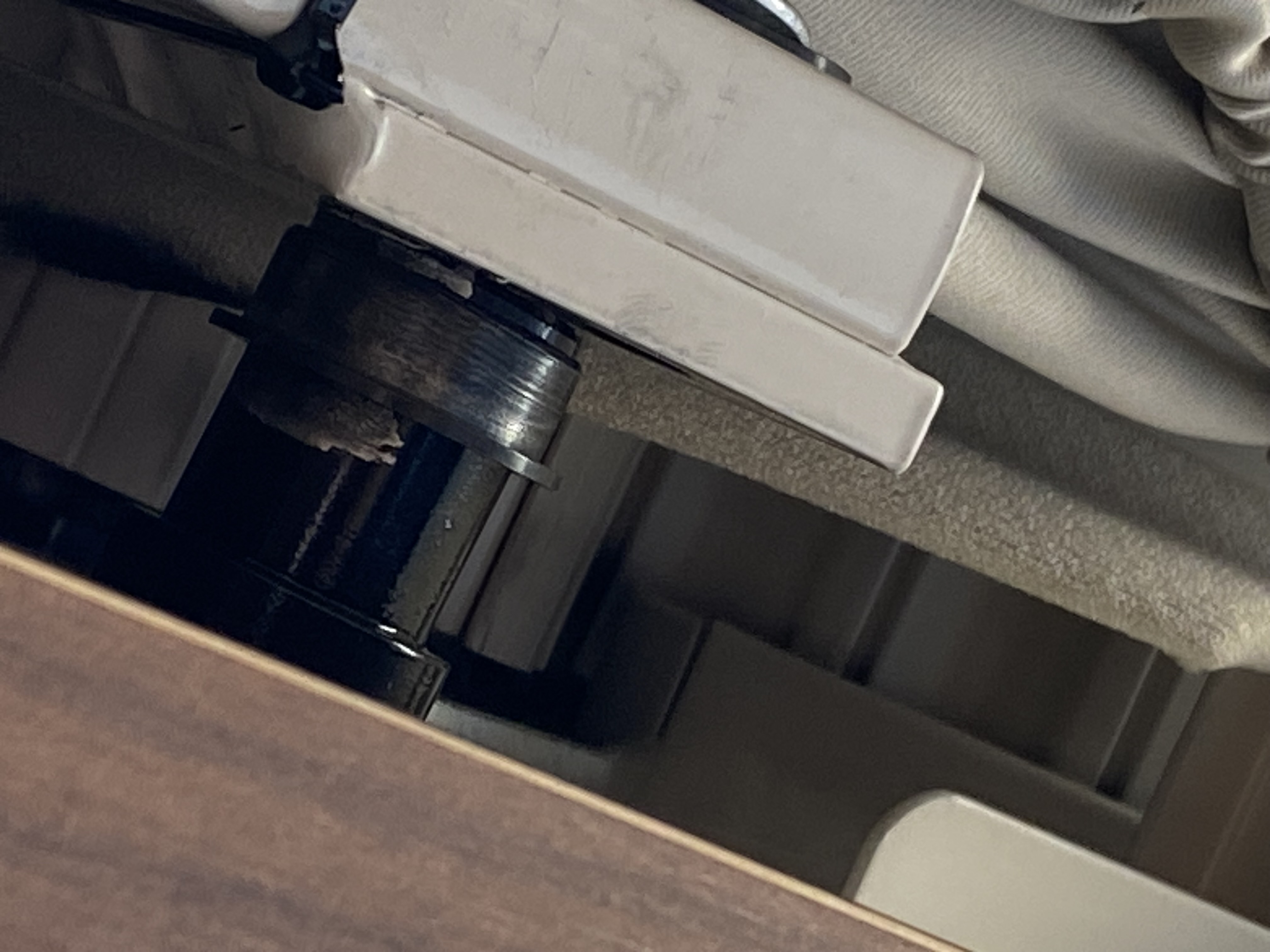 - le lit pavillon viens de sortir de son axe pivotant métallique d’ancrage du côté chauffeur : j’ai mis une vis assez longue avec une grande rondelle mais, impossible de remettre le bras métallique dans son axe d’ancrage. ( voir photo ci-jointe)